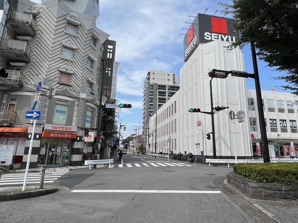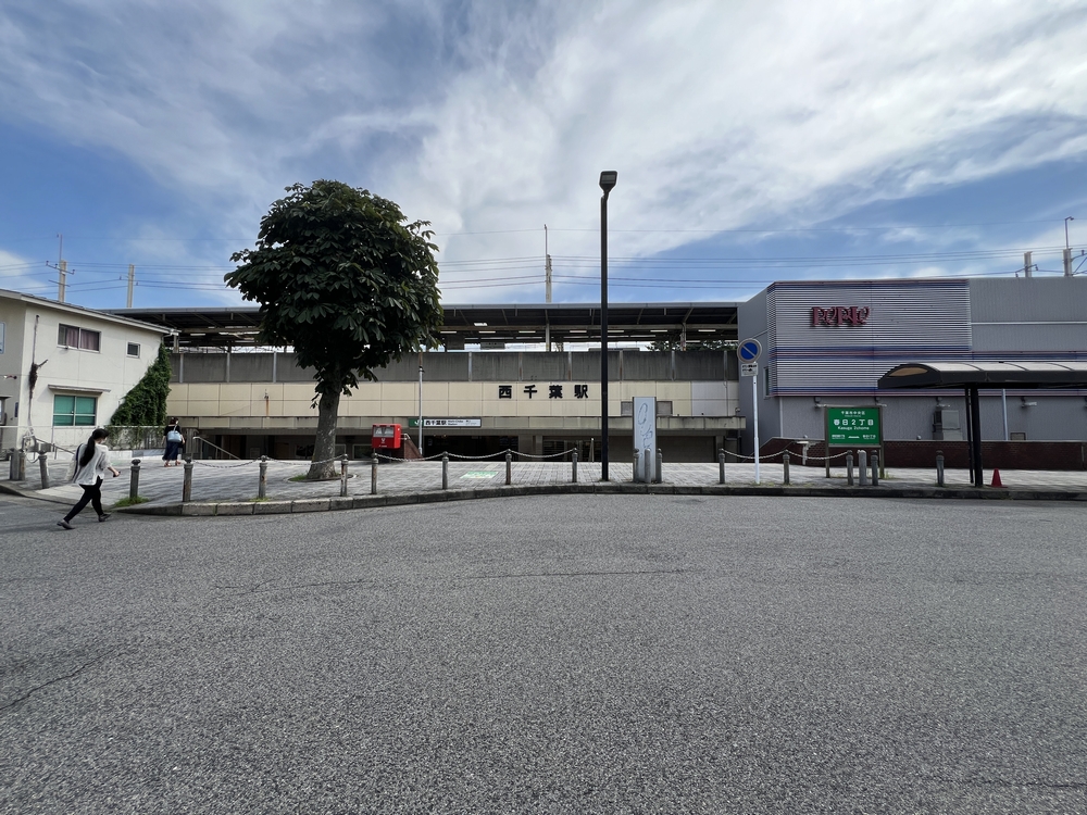 西千葉駅南口を背にしてロータリーを見ると、左側にフルヤマ薬局、右側に西友西千葉店が見える。